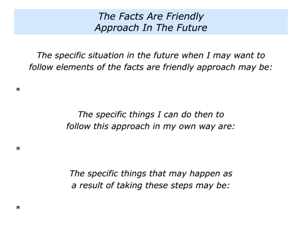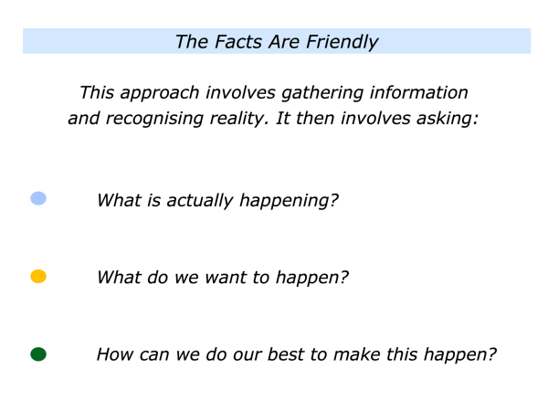 How can you embrace the attitude that the facts are friendly, even if some are uncomfortable? How can you choose your way forwards? How can you keep doing reality checks? How can you build on what is working and find solutions to any other challenges?