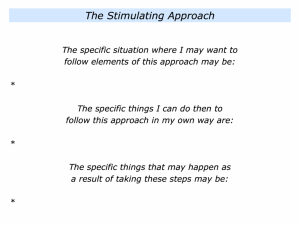 Let’s return to your own life and work. Looking ahead, can you think of a situation where you may want to follow some elements of the stimulation approach? How can you do this in your own way?