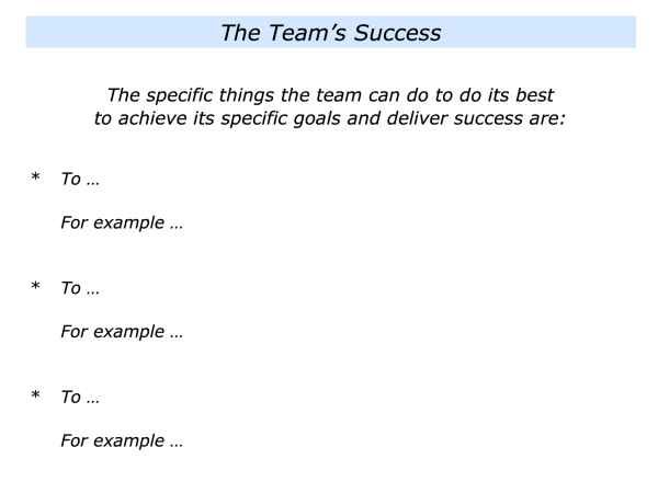 Teams that work in business, for example, can aim to be really customer focused. They can aim: a) to clarify the customer’s goals; b) to provide great service that helps the customer to achieve success; c) to also add that touch of class.