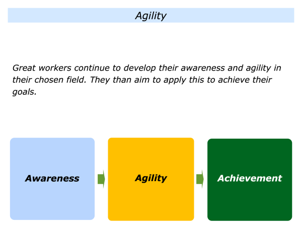 Great workers continue to build their strengths. They then apply their personal and professional agility to be proactive and stay ahead of the game.