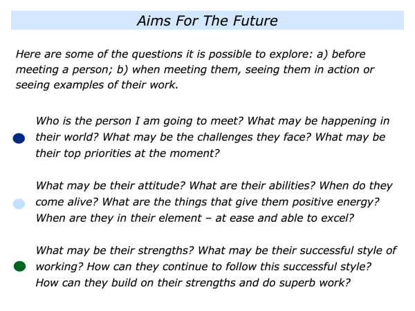 There are many other themes it is possible to explore when focusing on a person’s aims. Whatever route is followed, it is important: