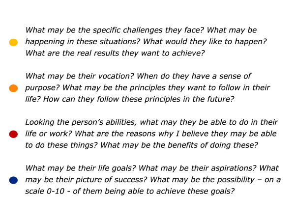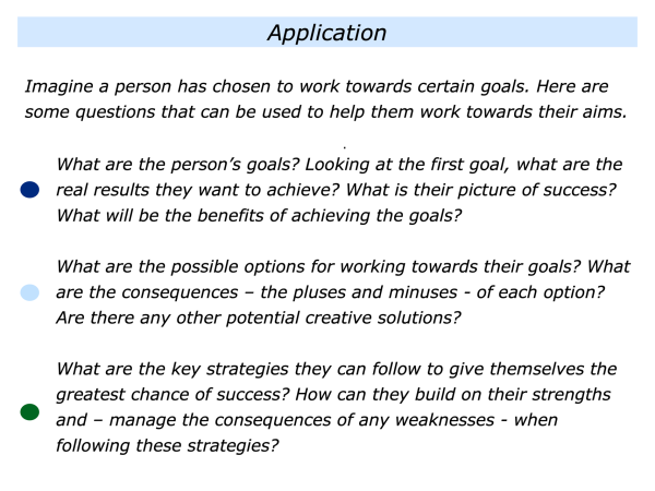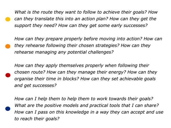 Imagine that you want to help a person to take these steps. How to make this happen? One approach is to explore the following themes when helping them to achieve their aims.