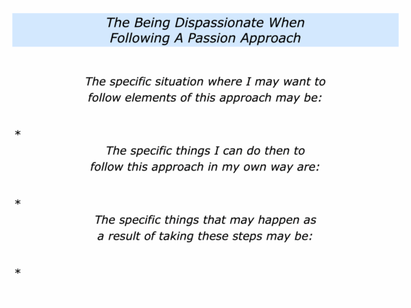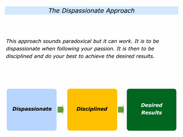 This approach sounds paradoxical but it can work. It is to be dispassionate when following your passion. It is then to be disciplined and do your best to achieve the desired positive results.