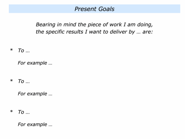 Such people focus on the present piece of work they are doing. Bearing in mind the real results they want to achieve, they clarify their present goals. Some do this by completing the following exercise.