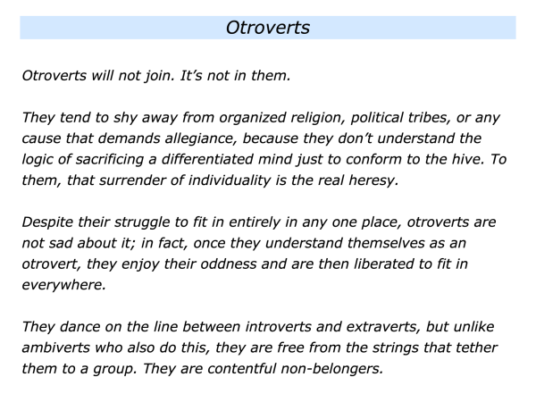 Jennifer Finch wrote an excellent article about otroverts – a term coined by Rami Kaminski. Otroverts are quite happy looking at certain things – such as organisations – from the outside. Here is an excerpt from her article.