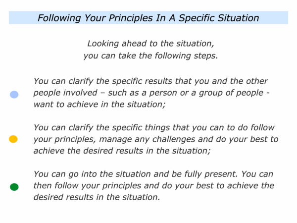 You can take time to prepare properly. You can rehearse how you follow your principles and manage any challenges. You can then go into the situation, be fully present and do your best to achieve the desired results.