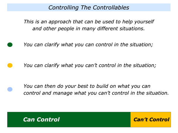 Controlling the controllables is an approach that can be used by individuals, teams or organisations. People can then focus their energies on the things they can do to shape their future lives.