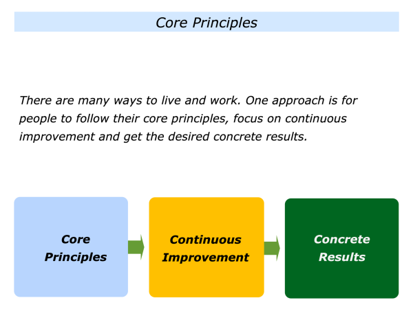 There are many ways to live and work. One approach is for people to follow their core principles, focus on continuous improvement and get the desired concrete results.