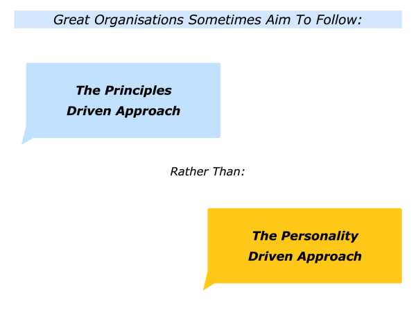 Such organisations may only thrive in the long-term if they become principles driven. One approach is for them to clarify and communicate their principles. They then encourage their people to follow these principles to achieve ongoing success.