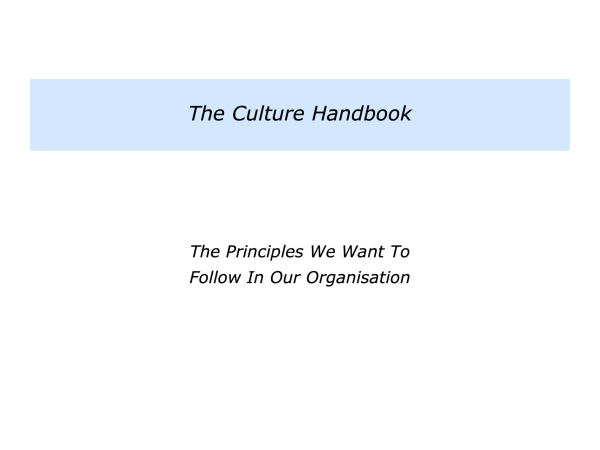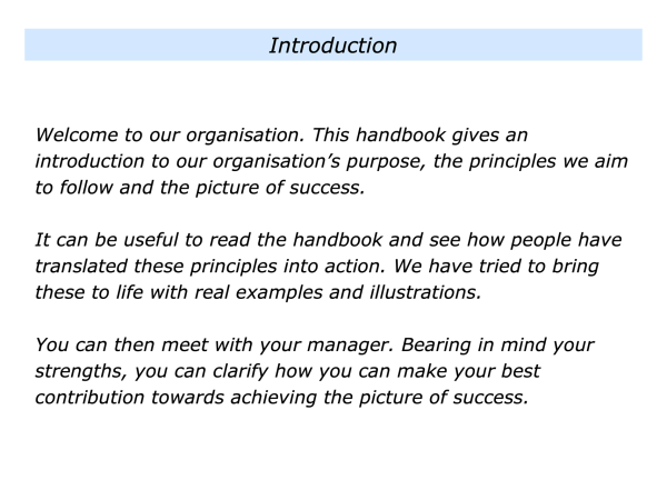 Here is a version of such a culture handbook. You would, of course, produce your own version and bring this to life by describing how people in the organisation have translated the principles into action.