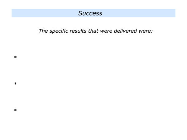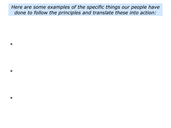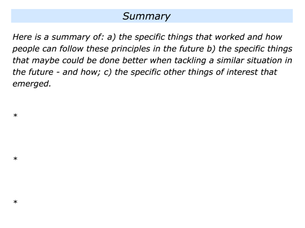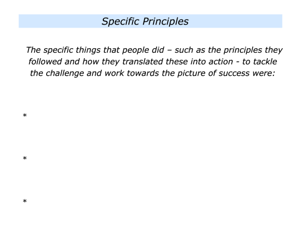 The next step is to describe the principles that people followed and how they translated these into action. It is then to describe the results that were delivered to achieve success.