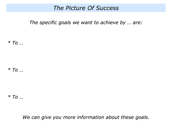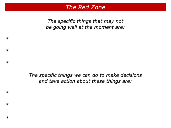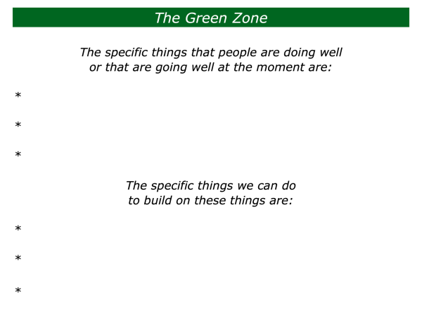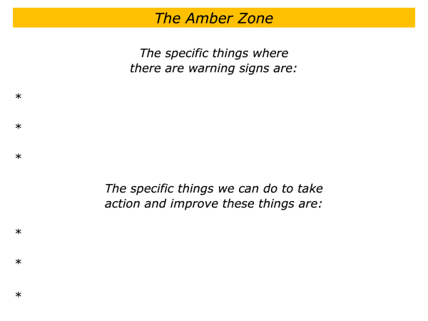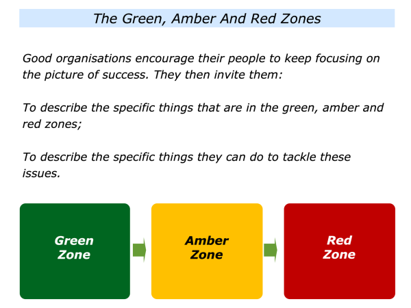 Some organisations sometimes take another route. Bearing in mind the goals to achieve – the picture of success – they encourage their people to keep reporting the things that are in the green, amber and red zones.