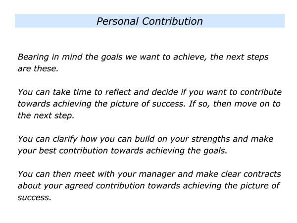 Some organisations also create a culture handbook that describes their purpose, principles and picture of success. This encourages people to keep making their best contributions towards achieving the goals.
