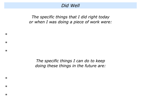 Such a person may set aside time to look back on their day or a piece of work they have done. If appropriate, they may then reflect on the following themes: