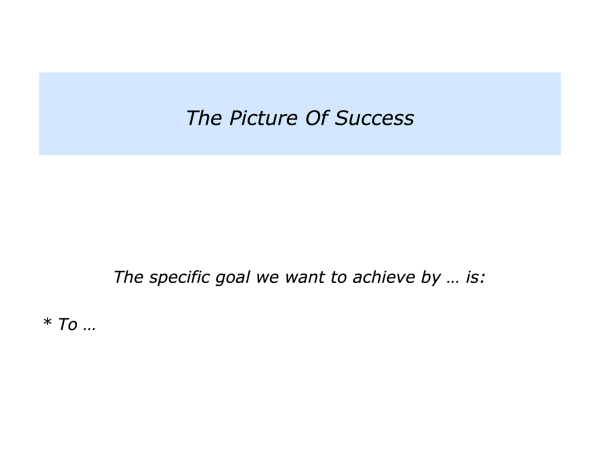 One company I worked with had a dedicated room where people kept focusing on the picture of success. They also kept doing reality checks regarding the activities that were in the green, amber and red zones. The room had charts that covered the following areas