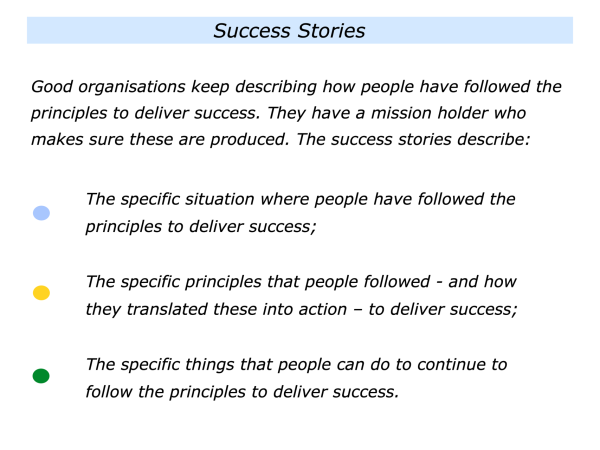 Good organisations educate and enable their people to follow the core principles and deliver the desired concrete results. Some then encourage their people to maintain the momentum by continually producing success stories.