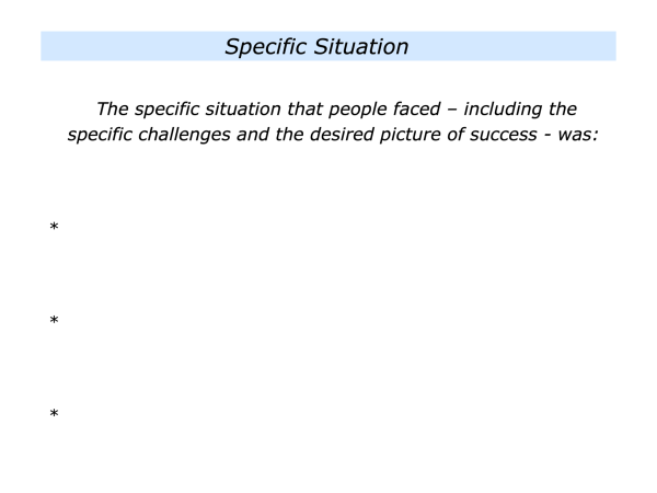 People could be helping a client, solving a problem, making systems work better or whatever. It is to describe the challenges they faced and the desired picture of success.