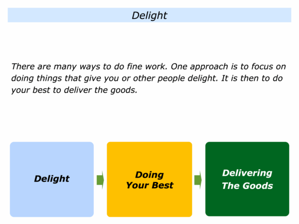 Let’s return to your own life and work. As mentioned earlier, there are many ways to do fine work. One approach is to focus on doing things that give you or other people delight. It is then to do your best and deliver the goods.