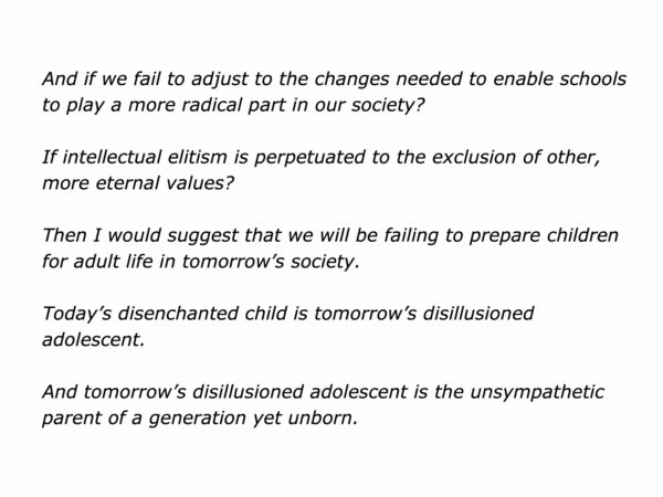 I was fortunate to visit the school on several occasions. It provided a magical environment in which children and teachers where encouraged to do their best work
