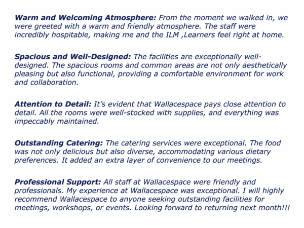 I always chose The Wallace Space for running workshops. The participants were delighted and many booked their own courses there. Here is just one testimonial plus snapshots of the places.