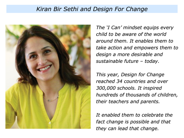 Kiran Bir Sethi has done superb work that helps people and the planet. She founded the Riverside School in Ahmedabad and the global movement called Design For Change.