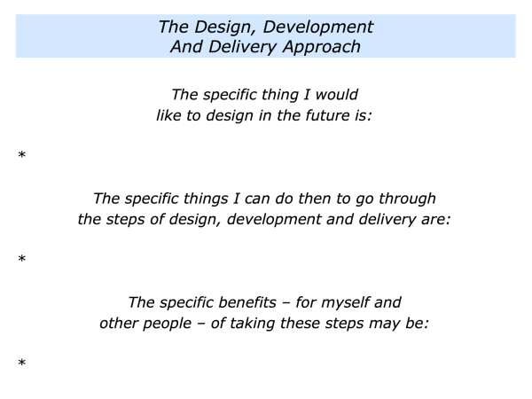 Let’s return to your life and work. Looking ahead, can you think of something you would like to design? If so, it can be useful to work through the following themes.
