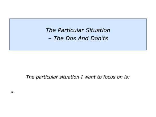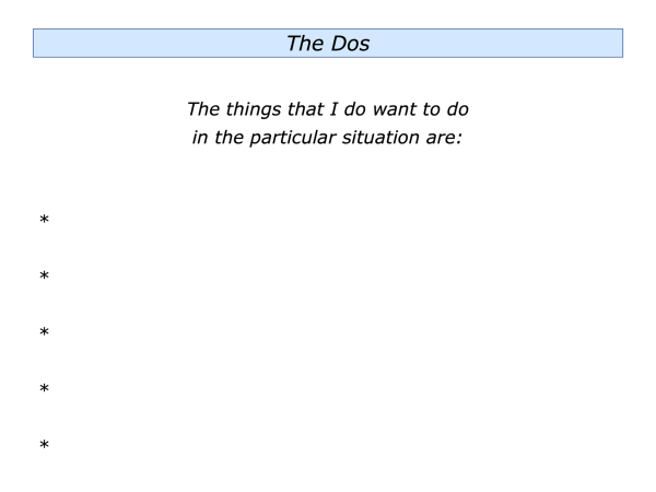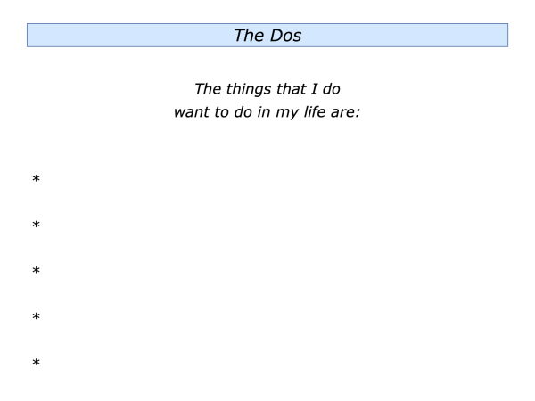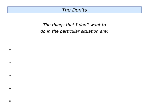 Let’s return to your own life. Can you think of a situation where you may want to follow elements of the Dos and Don’ts approach? This could be in your personal or professional life.