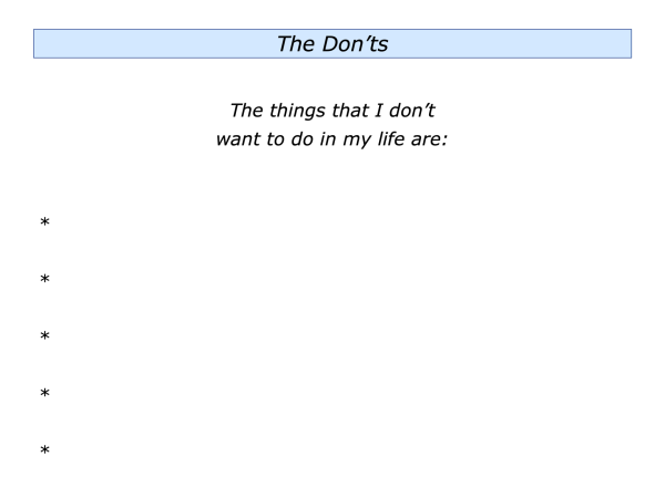 Let’s return to your own situation. Imagine that you want to clarify some of the Dos and Don’ts you want to follow in your life. The next step would be to try to translate these into action each day.