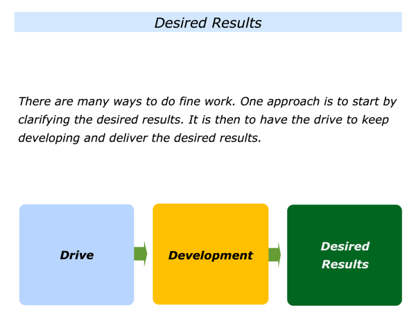 There are many ways to do fine work. One approach is to start by clarifying the desired results. It is then to have the drive to keep developing and deliver the desired results.