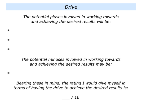 How can I build on the pluses and manage any minuses? Bearing these in mind, on a scale 0-10 how motivated am I to do what is required to reach the goal? How can I make sure it is at least 8+/10?