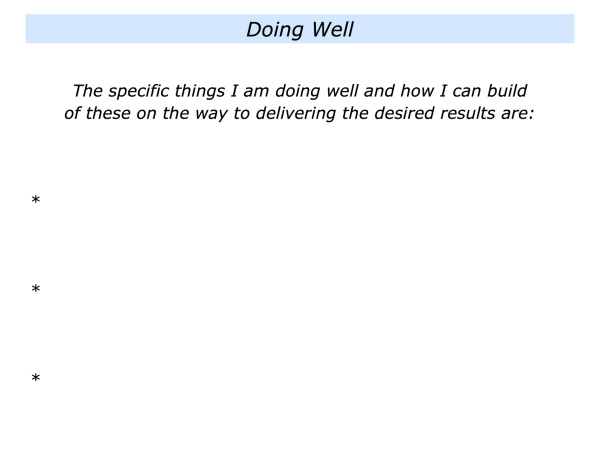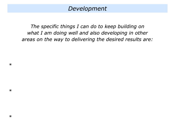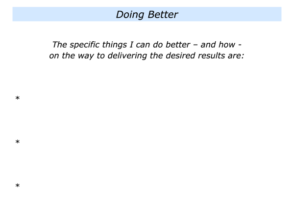 Great workers also aim to keep developing by continuing to focus on desired results. They then aim: a) to build on what they are doing well; b) to focus on what they can do better; c) to translate these ideas into action.