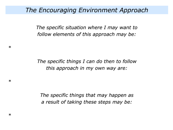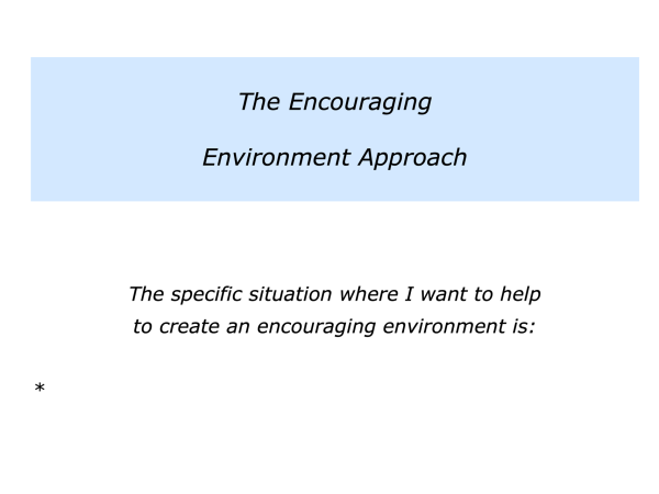 Let’s return to your own work. Can you think of a particular situation where you want to help to create an encouraging environment. You may want to focus on one in your professional life.