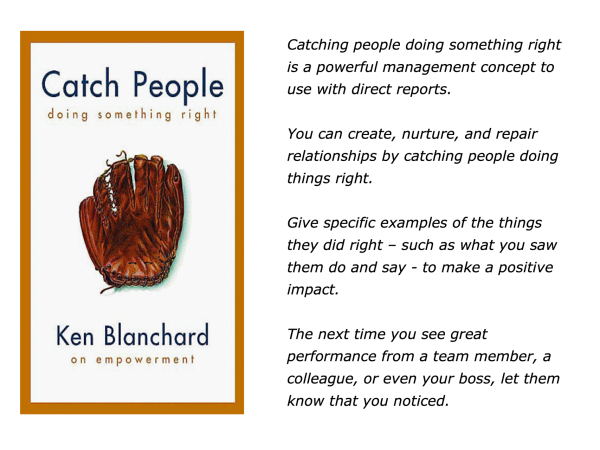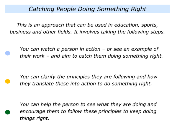 Some leaders follow the philosophy of ‘catching people doing something right’. This is an approach that has been used by many encouragers in education, sports, business and other fields. Here is an overview of the approach.