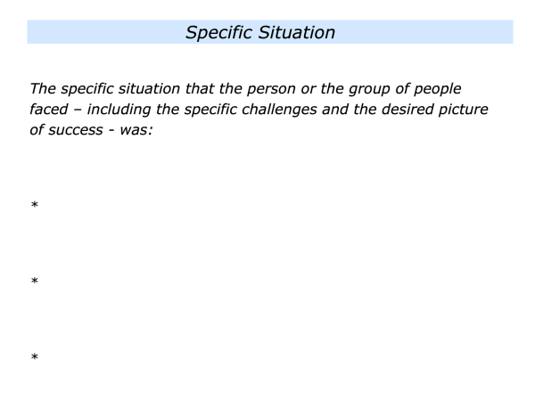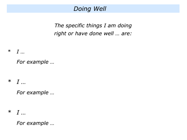 This approach encourages people to focus on the specific things they are doing in their lives or work. It then invites them to complete the following sentences.
