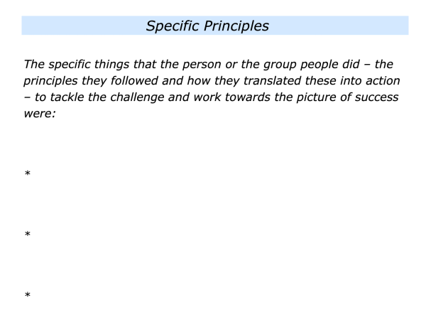 They explain how people can follow the principles – together with examples that bring these to life – and help to achieve the picture of success.