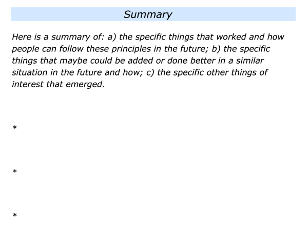 Imagine that you have explained the goals and guidelines to follow in a particular situation. It can then be time to focus on the following theme.