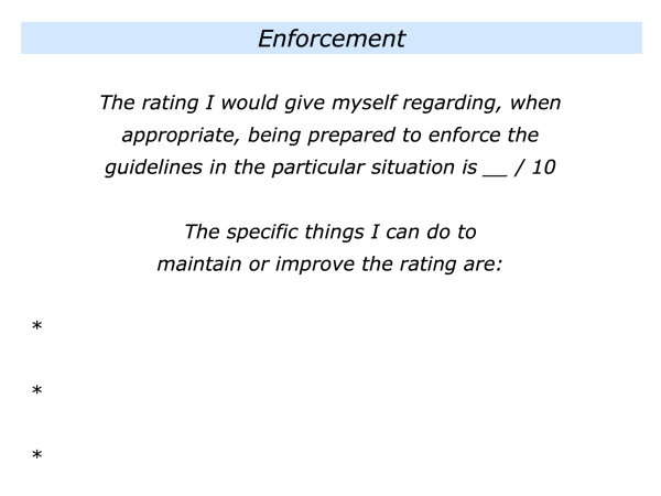 Let’s return to your own work. Imagine that you have chosen to focus on a particular situation in your professional life. Looking at this situation, how good do you think you are at, when appropriate, being prepared to enforce the guidelines?