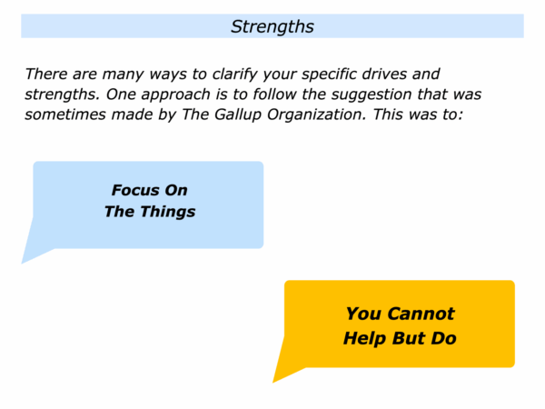 There are many ways to clarify your specific drives and strengths. One approach is to follow the suggestion that was sometimes made by The Gallup Organization. This was to:
