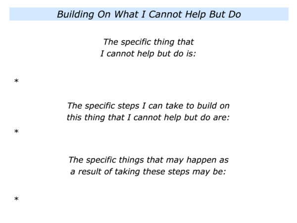 There are many ways to clarify your specific drives and strengths. One approach is to build on what you cannot help but do. It is then to keep doing these things in the future.