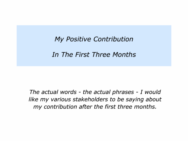 This is a well-known exercise that invites a person to focus on how they can do good work in their first three months. It invites them:
