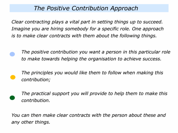 Imagine that you are hiring somebody for a senior role. You will probably have communicated the specific outcomes they will be expected to deliver. It will then be to make clear contracts about the following things.