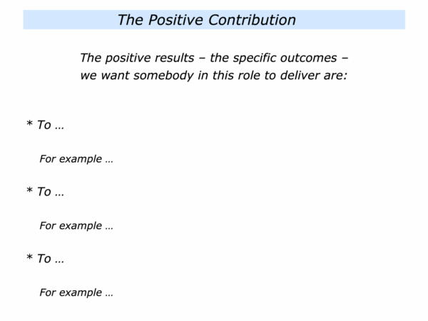The positive contribution – the specific outcomes – you want the person to deliver in a particular role;