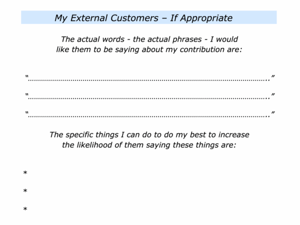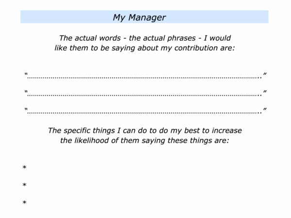 To continue to make clear contracts with my stakeholders about the specific outcomes to achieve … To behave in a professional way towards my colleagues and customers … To get some early wins.