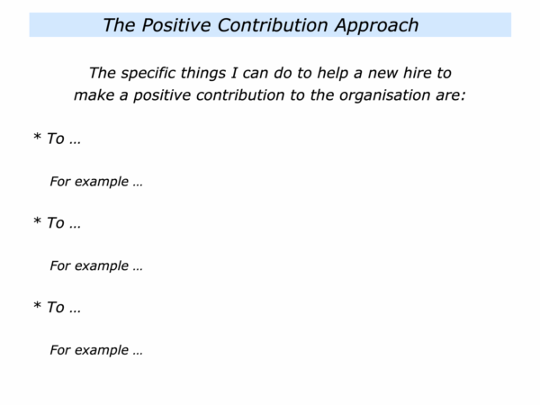 If you wish, try tackling the exercise on this theme. This invites you to describe how you may want to help a new hire to make a positive contribution.