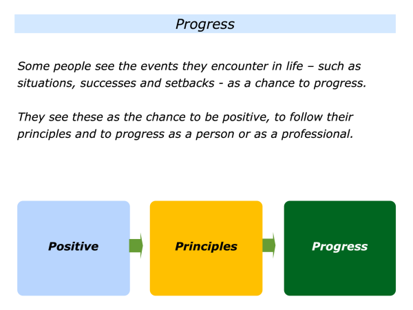Some people also see the events they encounter in life – such as situations, successes and setbacks – as a chance to progress. They see these as the chance to be positive, to follow their principles and to progress as people or professionals.
