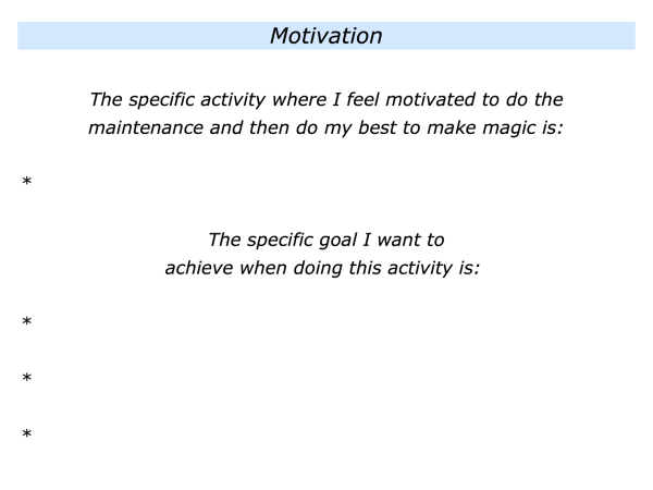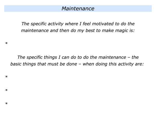 Imagine that you are pursuing your chosen activity and working towards a specific goal. The next step will be to focus on doing the maintenance – the basic tasks that must be done – to reach the goal.