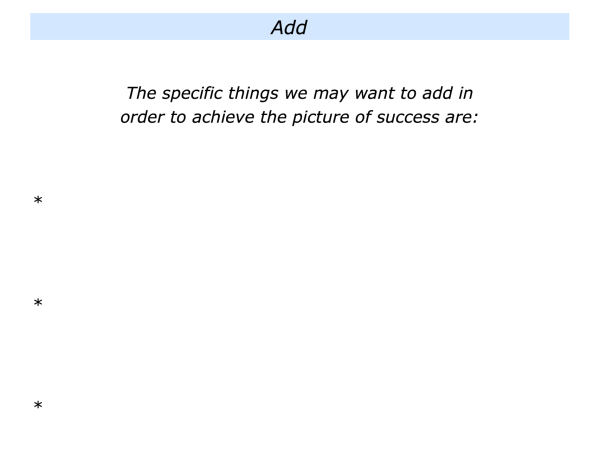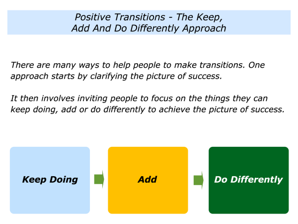 There are many ways to help people to make transitions. This section has described one approach. It is to encourage them to focus on what they can keep doing, add or do differently to achieve a picture of success.