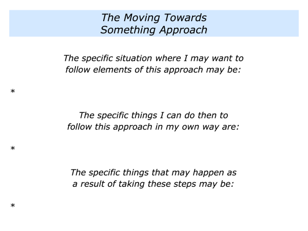 The moving towards something approach often involves putting something positive in place rather than simply trying to remove the problem. One way to do this is to follow elements of the positive addictions approach.