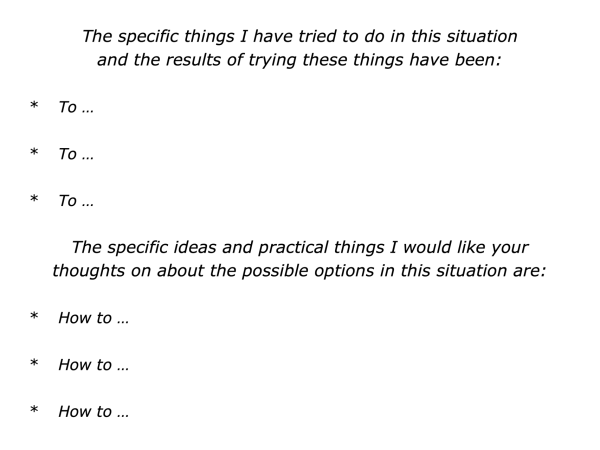 The specific ideas and practical tools I would like your thoughts on regarding the possible options in this situation are …