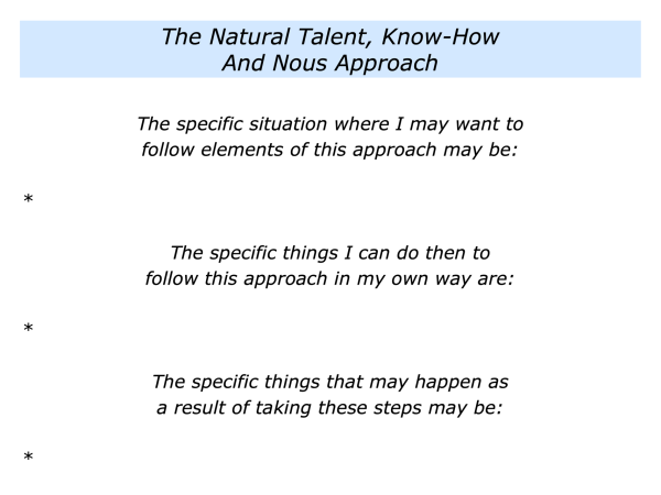 This step involves helping a person to add the nous required to make the best use of their talent. There are several definitions of the word nous. These include a person using their experience: